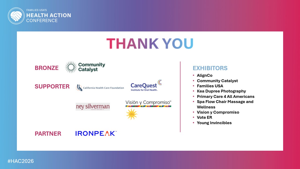 Families USA would like to sincerely thank our sponsors and exhibitors for their generous support and participation. Their contributions play an important role in making this conference possible. We appreciate their commitment and invite you to recognize the organizations displayed below.